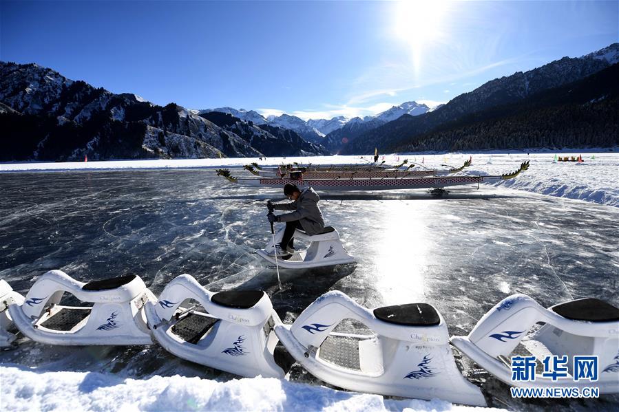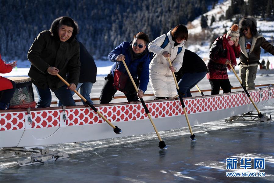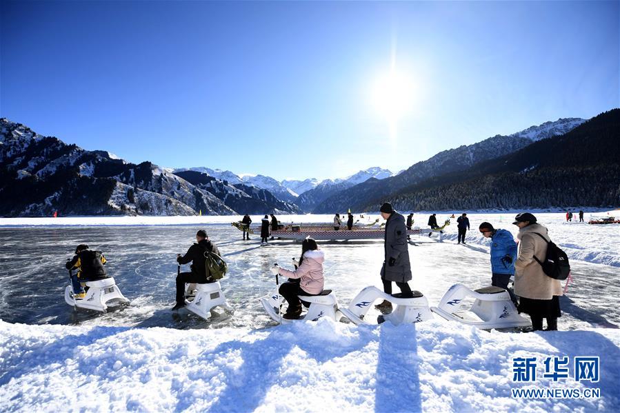 1月18日,游客在新疆天池景区玩冰上龙舟。新华社记者 沙达提 摄