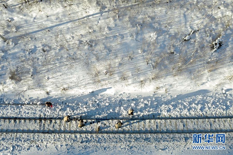 1月13日,白音库伦综合维修车间职工在作业点清理积雪(无人机照片)。新华社记者刘磊摄