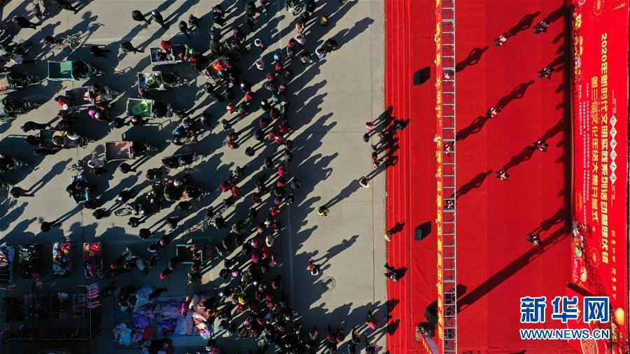 1月19日,老百姓在姚伏年货大集上观看各村自编自演的文艺节目(无人机照片)。 新华社记者 冯开华 摄