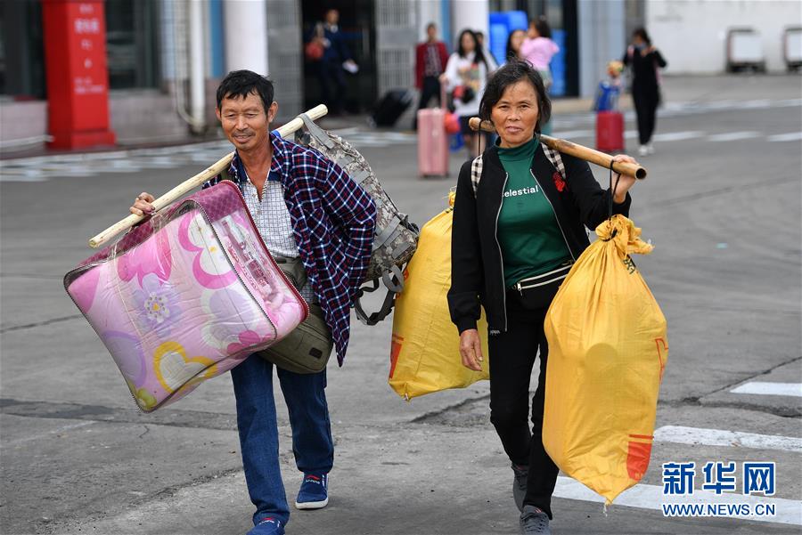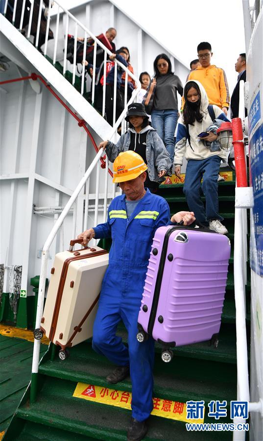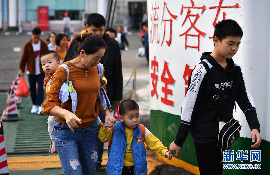 1月19日,来自湖南的务工人员在海口秀英港轮渡码头登船返乡。 新华社记者 郭程 摄