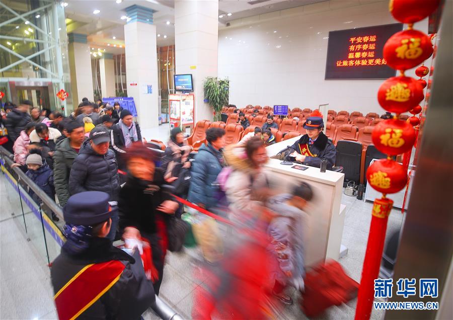 1月18日,王丽丽(右一)为旅客检票。新华社记者 龙雷 摄