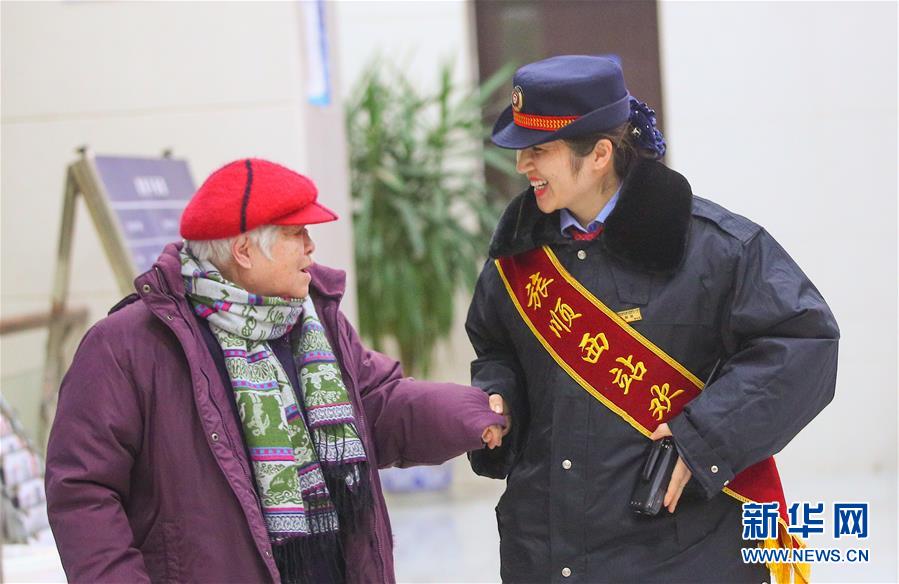 1月18日,王丽丽搀扶一位候船的老人。新华社记者 龙雷 摄