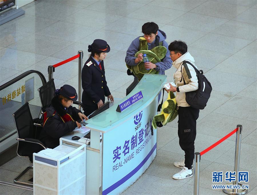 1月19日,王娟娟(左二)为旅客进行实名制登记。新华社记者 龙雷 摄