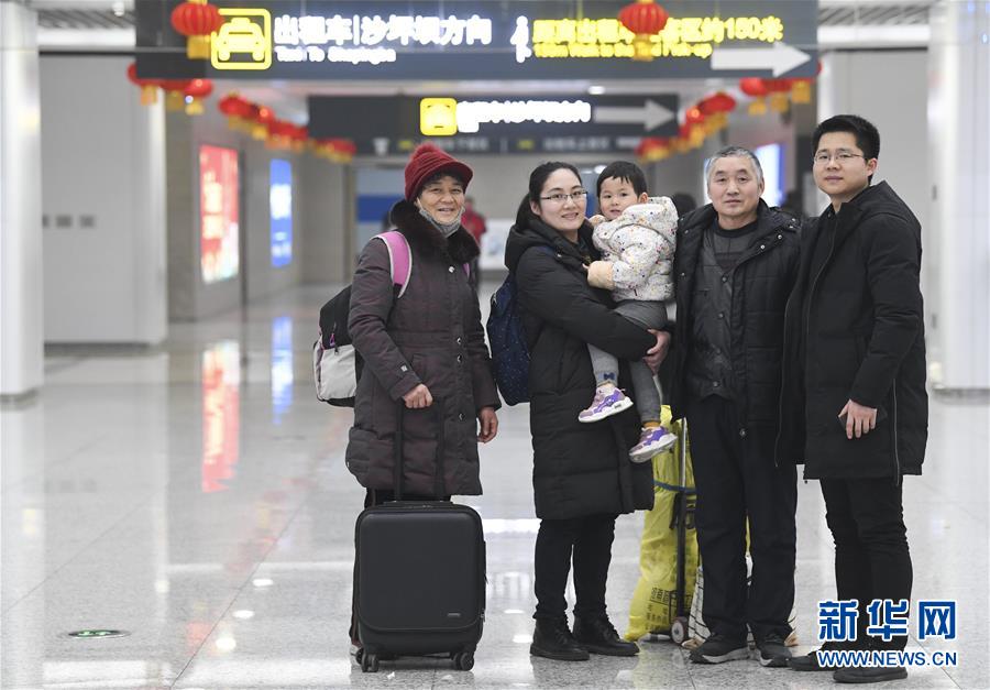 1月19日,来自河南周口的鲁培宪(右二)、刘保花(左一)夫妇在重庆西站出站口同前来接站的女儿、女婿合影。 新华社记者 王全超 摄