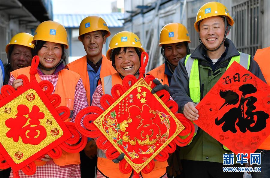 1月19日,中建三局西安一项目工地的农民工展示刚刚收到的“福”字。 当日,中建三局西安一项目工地开展“关爱农民工 温暖回乡路”活动,通过开展节前安全教育、发放慰问品等方式,为农民工送上节日祝福。 新华社记者 刘潇 摄