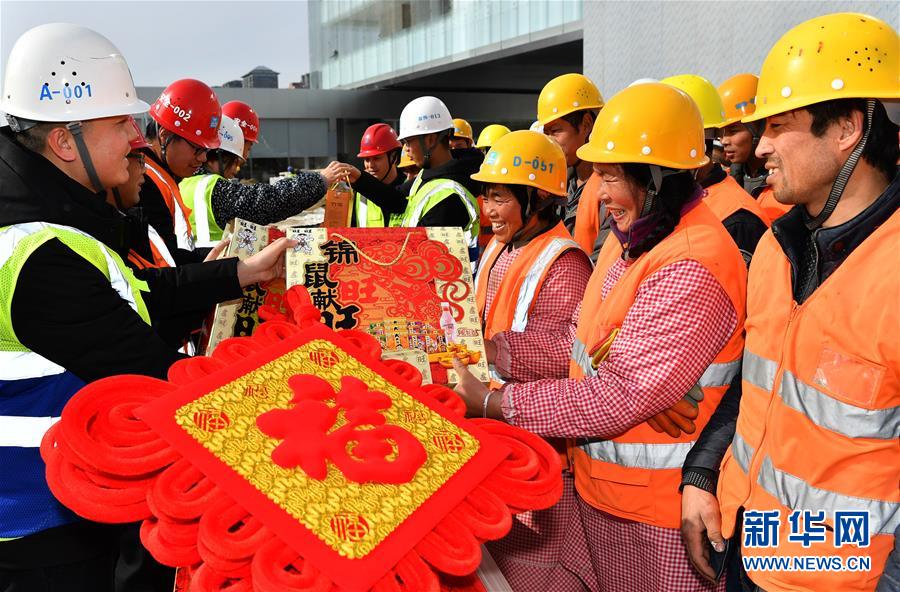 1月19日,中建三局西安一项目工地的工作人员为工友们送上返乡礼包。 新华社记者 刘潇 摄