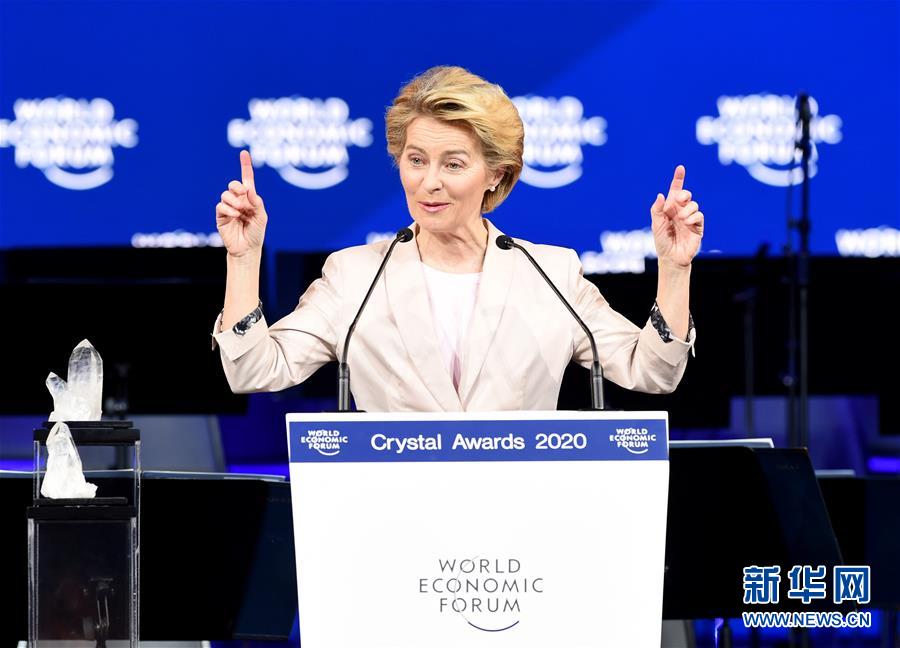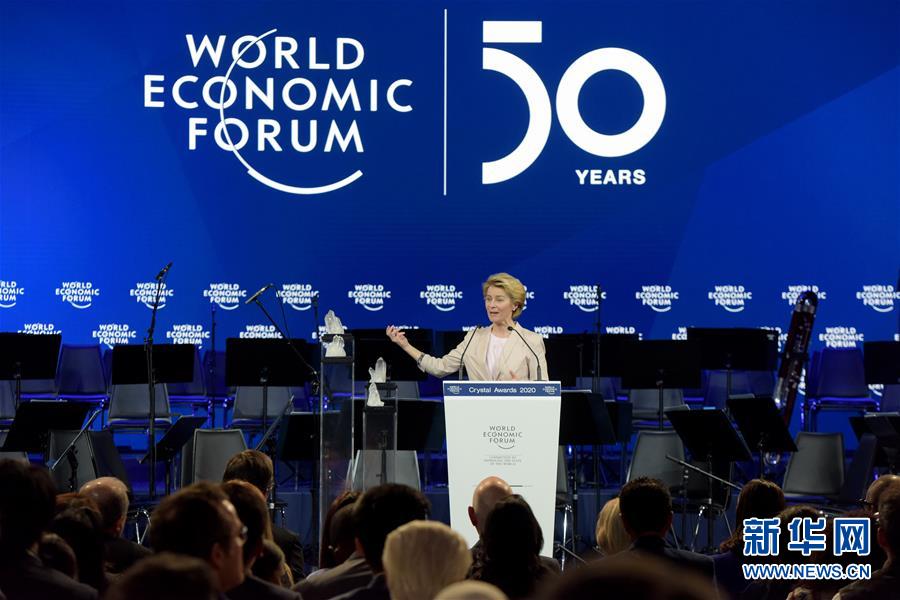 1月20日,在瑞士小镇达沃斯,欧盟委员会主席冯德莱恩致辞祝贺世界经济论坛50周年。 新华社记者 郭晨 摄