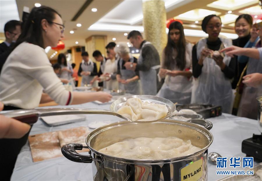 1月19日,在美国纽约举行的中外青年迎新春联欢会上,中外学生一起学包饺子。 当天,中国驻纽约总领馆举办中外青年迎新春联欢会。200多名就读于哥伦比亚大学、纽约大学、耶鲁大学等20余所美国高校的中外学生参加此次活动,共庆中国农历新年的到来。 新华社记者 王迎 摄