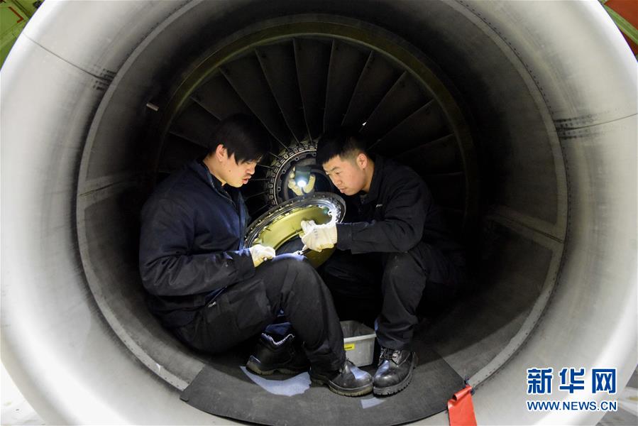 飞机维修工程师在检查发动机进气道部件(1月21日摄)。 新华社记者 丁磊 摄