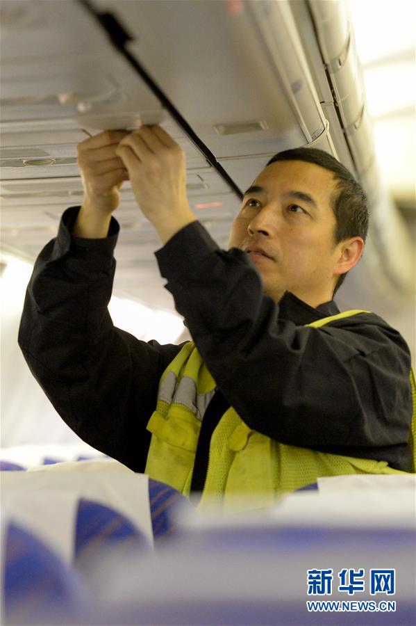 飞机维修工程师在客舱内更换旅客照明灯(1月21日摄)。 新华社记者 丁磊 摄
