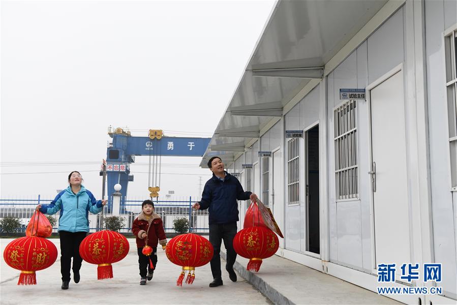 1月21日,在位于安徽滁州的中铁四局滁宁城际铁路一期工程项目部驻地,蒋皓(右)和妻子柯菁兰(左)、儿子蒋奉哲准备挂灯笼,迎接春节。