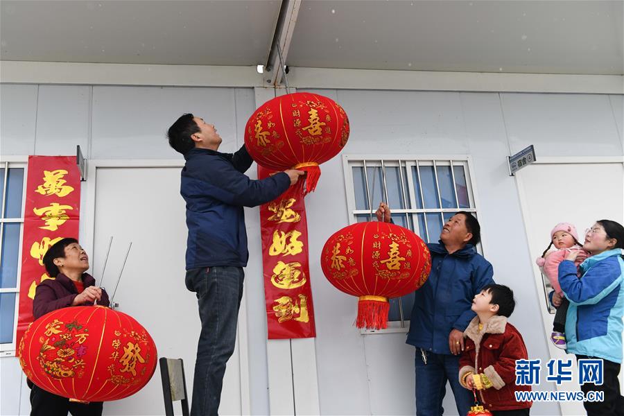 1月21日,在位于安徽滁州的中铁四局滁宁城际铁路一期工程项目部驻地,蒋皓(左二)在挂灯笼迎接春节,他的父亲蒋高建(左三)、母亲周美英(左一)、妻子柯菁兰(右一)和儿女在一旁。新华社记者 张端 摄