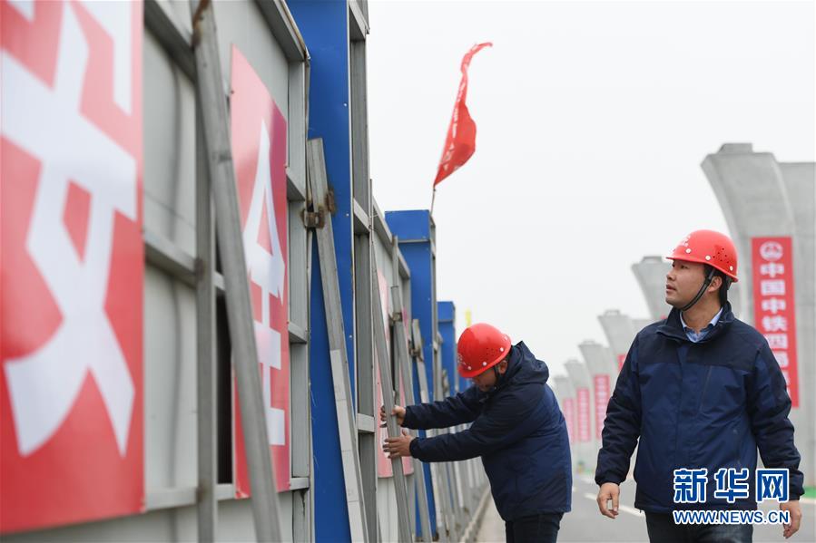 1月21日,在位于安徽滁州的中铁四局滁宁城际铁路一期工程项目建设工地,蒋皓(右)在进行安全巡查。新华社记者 张端 摄