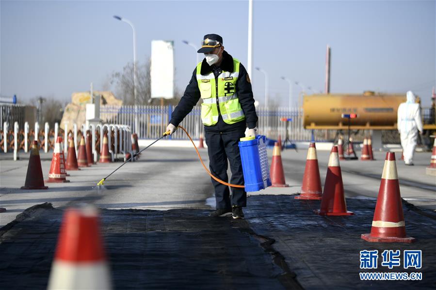 在银川市黄河辅道桥检查站,银川市公路路政支队稽查三大队的工作人员在对检查站地毯进行喷雾消毒(1月31日摄)。新华社记者王鹏摄