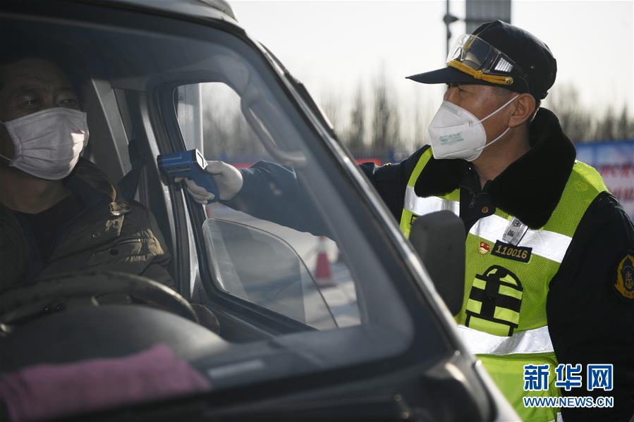 在银川市黄河辅道桥检查站,银川市公路路政支队稽查三大队的工作人员在为过往车辆司机测量体温(1月31日摄)。新华社记者王鹏摄