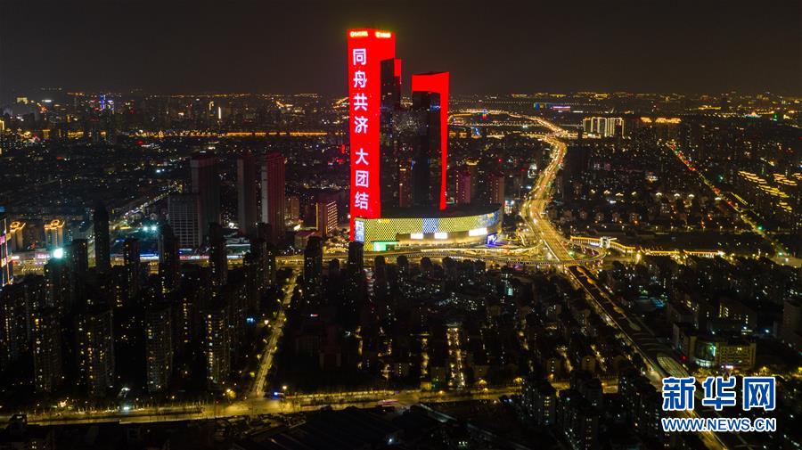 2月2日,南京市一处高层建筑的外立面打出“同舟共济大团结”标语(无人机照片)。新华社记者李博摄