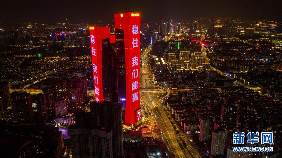 2月2日,南京市一处高层建筑的外立面打出“稳住我们能赢”标语(无人机照片)。新华社记者李博摄