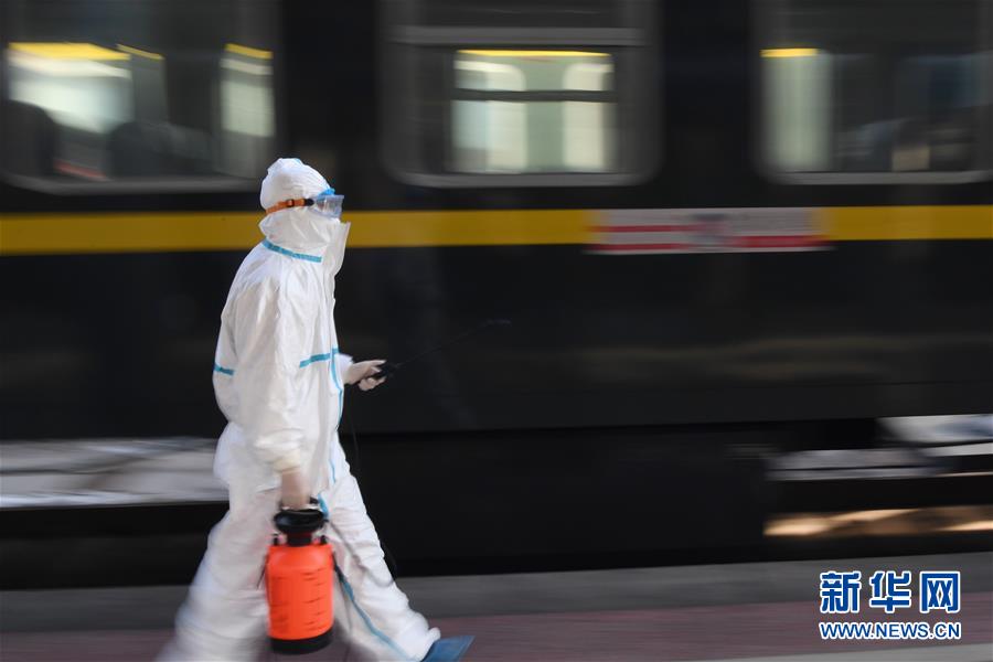 2月3日,中国铁路兰州局集团有限公司疾病预防控制所工作人员杨凯从K9668次列车旁走过。为做好新型冠状病毒感染的肺炎疫情防控工作,中国铁路兰州局集团有限公司疾病预防控制所的工作人员近期全天候轮班上岗,对兰州火车站的列车开展消毒防疫工作,确保列车重点部位经过严格细致的消毒。新华社记者陈斌摄
