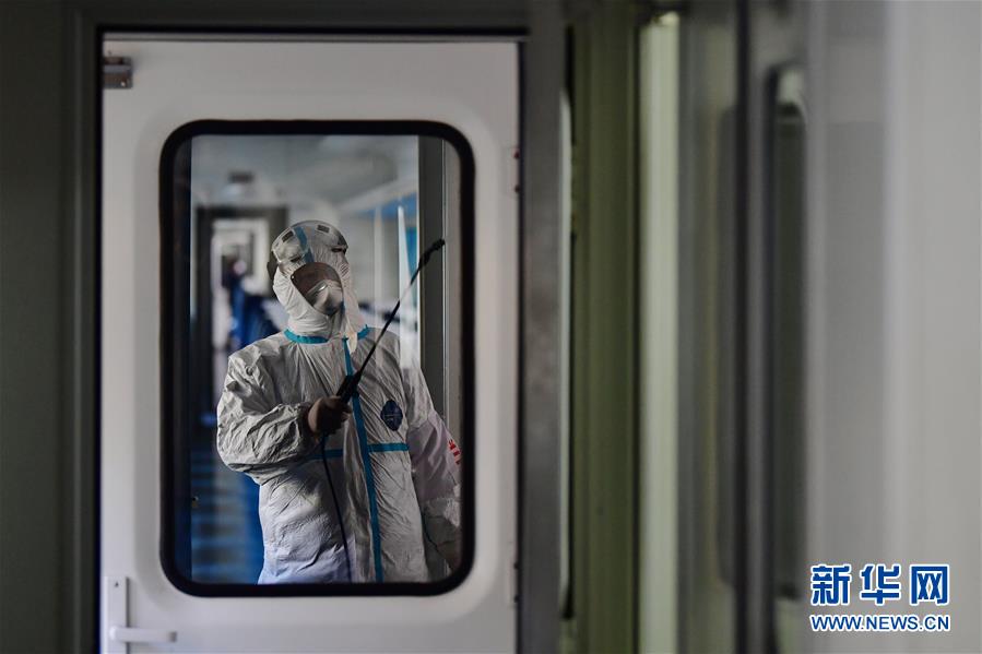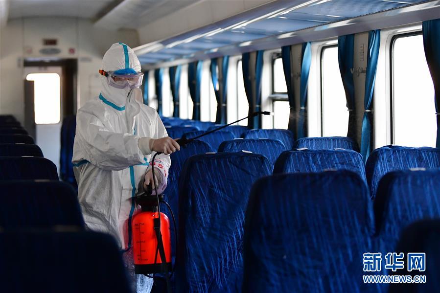 2月3日,中国铁路兰州局集团有限公司疾病预防控制所工作人员杨凯在K9668次列车上进行消毒作业。为做好新型冠状病毒感染的肺炎疫情防控工作,中国铁路兰州局集团有限公司疾病预防控制所的工作人员近期全天候轮班上岗,对兰州火车站的列车开展消毒防疫工作,确保列车重点部位经过严格细致的消毒。新华社记者陈斌摄