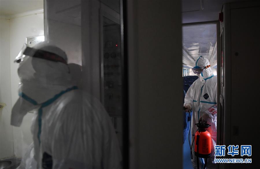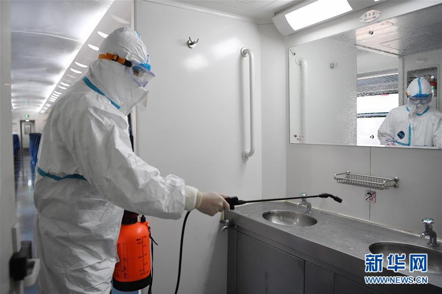 2月3日,中国铁路兰州局集团有限公司疾病预防控制所工作人员徐国祥在K9668次列车上进行消毒作业。为做好新型冠状病毒感染的肺炎疫情防控工作,中国铁路兰州局集团有限公司疾病预防控制所的工作人员近期全天候轮班上岗,对兰州火车站的列车开展消毒防疫工作,确保列车重点部位经过严格细致的消毒。新华社记者陈斌摄