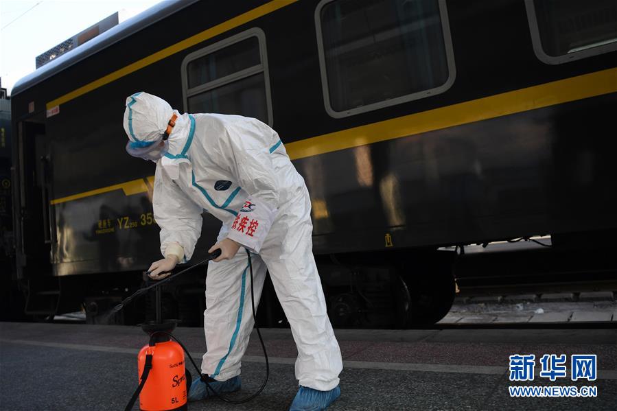 2月3日,中国铁路兰州局集团有限公司疾病预防控制所工作人员杨凯在兰州火车站站台上进行消毒作业前准备工作。为做好新型冠状病毒感染的肺炎疫情防控工作,中国铁路兰州局集团有限公司疾病预防控制所的工作人员近期全天候轮班上岗,对兰州火车站的列车开展消毒防疫工作,确保列车重点部位经过严格细致的消毒。新华社记者陈斌摄