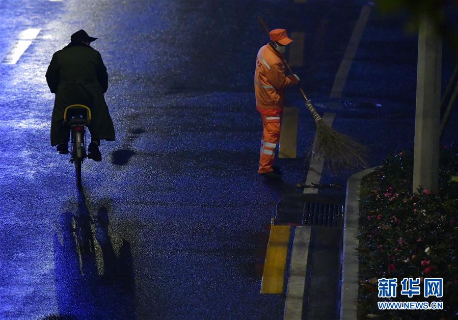 2月3日早5点,一位环卫工人在武汉解放大道路旁进行清扫作业。新华社记者李贺摄