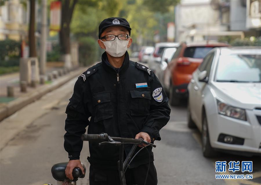 2月3日,武汉长江现代物业有限公司的保安徐闯在小区巡查。新华社记者程敏摄