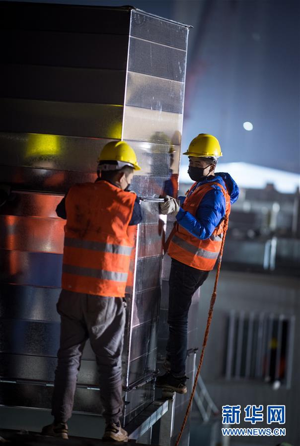 2月3日,中建三局工人王一凡(右)在武汉火神山医院楼顶安装通风管道。新华社记者肖艺九摄