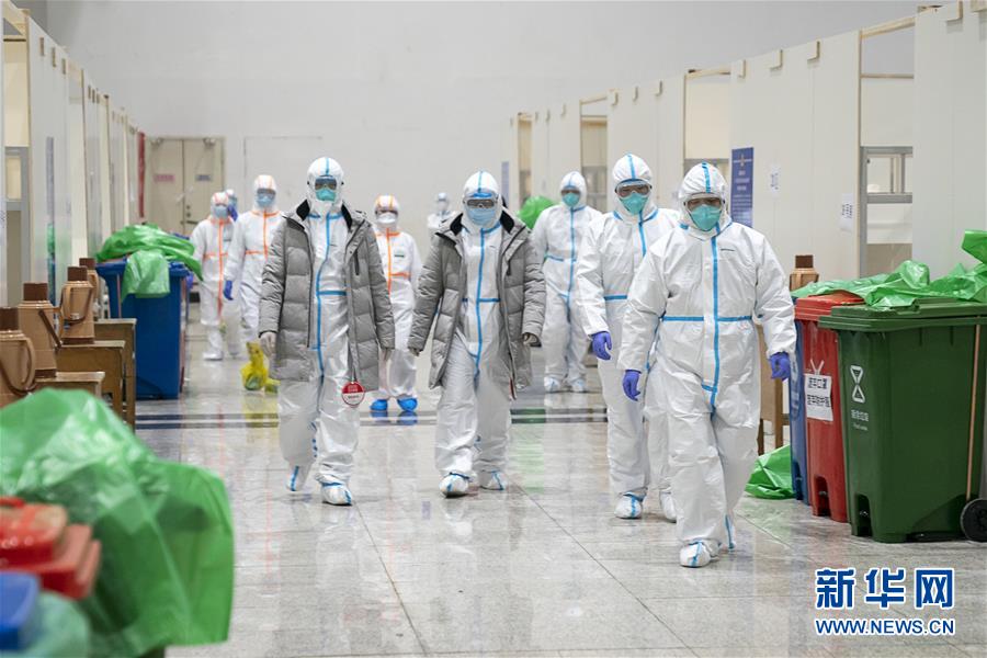 2月5日,医护人员在江汉方舱医院内。当日22时,位于武汉市江汉区武汉国际会展中心的“方舱医院”正式启用,开始接收新型冠状病毒感染的肺炎轻症患者。这座“方舱医院”名为江汉方舱医院,床位数1600张。新华社记者熊琦摄