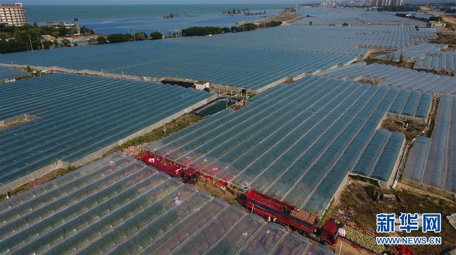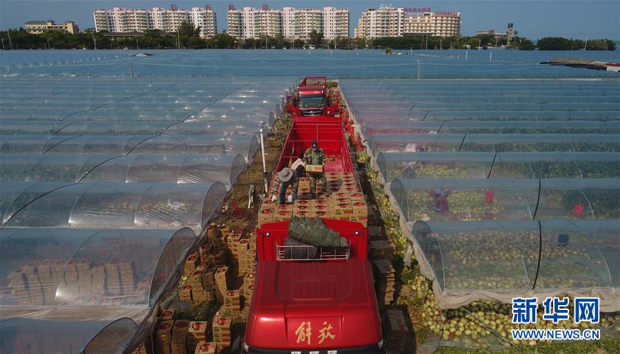 2月6日,在海南省乐东黎族自治县佛罗镇青山村瓜地,食品企业鲜丰水果股份有限公司的工作人员在把收购的哈密瓜装车(无人机照片)。新华社记者 杨冠宇 摄