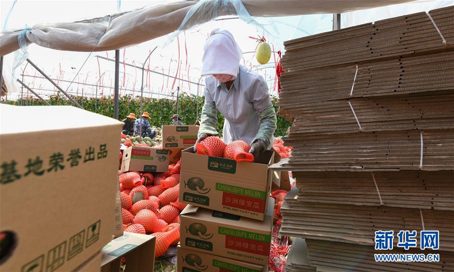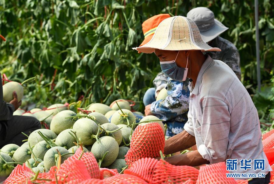 2月6日,在海南省乐东黎族自治县佛罗镇青山村瓜地,食品企业鲜丰水果股份有限公司的工作人员在为收购的哈密瓜套网套。新华社记者 杨冠宇 摄