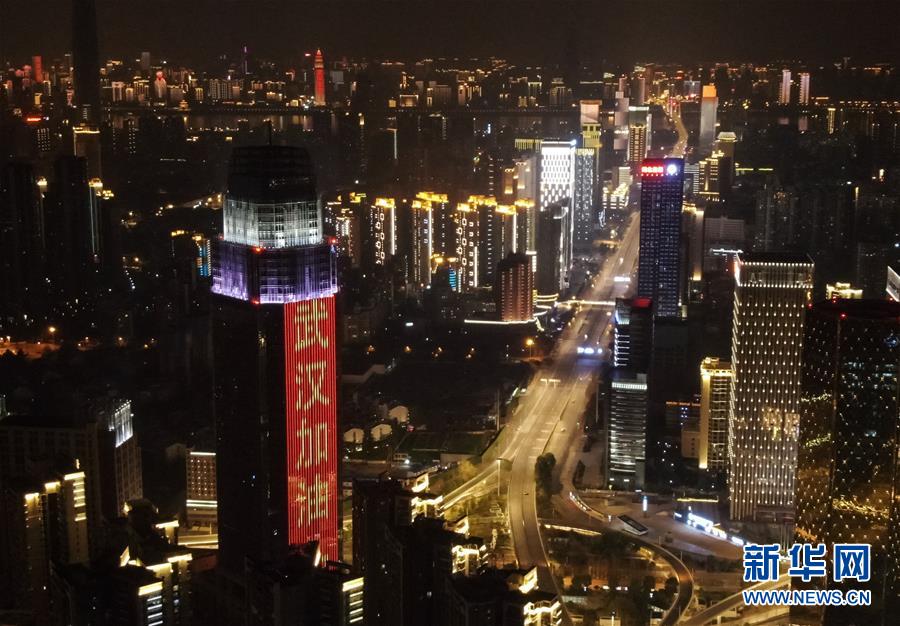 2月8日,武汉一高层建筑的景观灯打出“武汉加油”的字样。新华社记者程敏摄