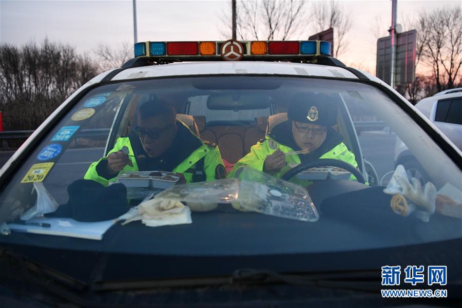 正月十五元宵节,在津沧高速出口前毕庄收费站,天津市交通运输综合行政执法总队轨道交通支队的执法队员罗德盛和孙建国已经在防控一线忙碌了约10个小时,趁着排队检查车辆不多时,二人才拿着盒饭窝在车里快速地吃起来。