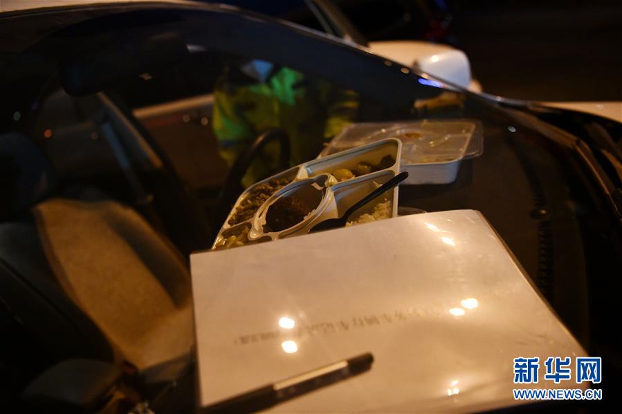 2月8日,因检查站出现塞车情况,罗德盛将还未吃完的盒饭放在车前。 新华社记者 李然 摄