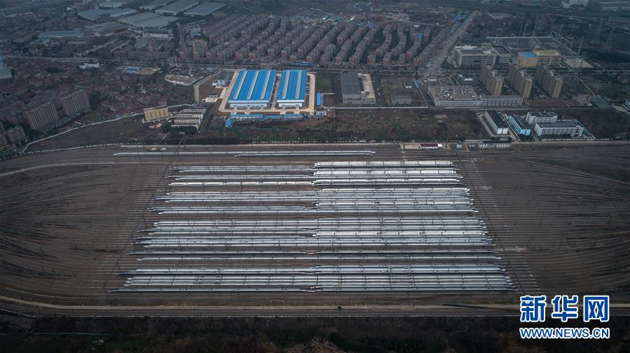 2月10日,动车组列车停放在武汉动车段的存车线上(无人机照片)。为全力打好新冠肺炎疫情防控阻击战,最大限度防止疫情通过铁路途径传播和扩散,按照铁路部门运输方案,目前湖北境内始发、终到列车和中国铁路武汉局集团公司值乘的列车已全部停运或调整,中国铁路武汉局集团公司配属的200余组动车组除少量用作检测和热备以外,其余全部停放在武汉动车段存车线上。新华社记者肖艺九摄