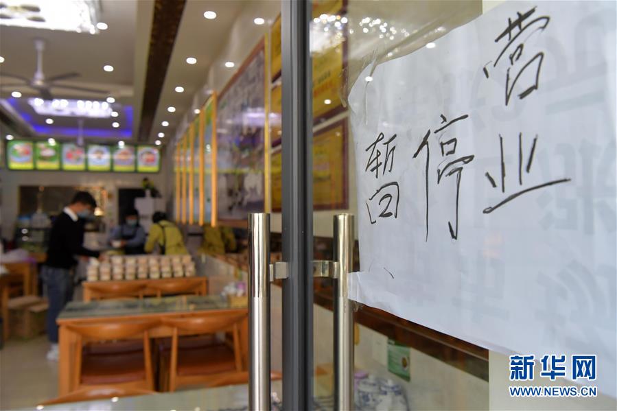 2月10日,在江西省南昌市红谷滩新区,韩海明在自己开的拉面馆里准备要送的午饭,门口他贴上了暂停营业的告示。新华社记者彭昭之摄