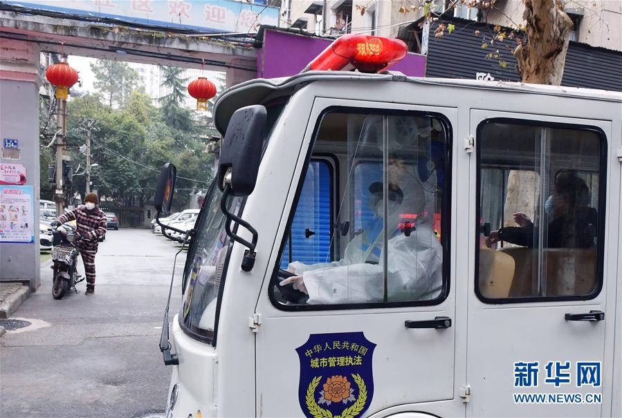 2月10日,一辆转运车在武汉市江汉区德望社区接到一位确诊患者送往“方舱医院”。新华社记者李贺摄