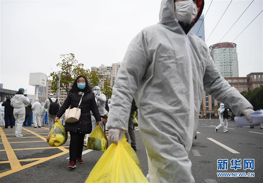 2月11日,社区工作人员将出院患者接回家。 当日,武汉市武昌方舱医院首批新冠肺炎轻症患者经过治疗出院。 新华社记者 程敏 摄