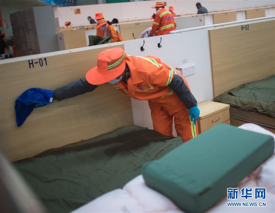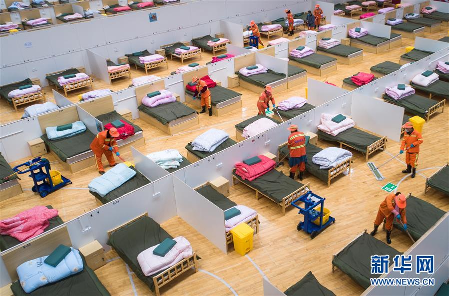 2月12日,在武汉体育中心方舱医院,工人在进行整理和清洁工作。当日,武汉体育中心方舱医院具备收治条件,这里将提供1100张医疗床位,收治新冠肺炎轻症患者。新华社记者程敏摄