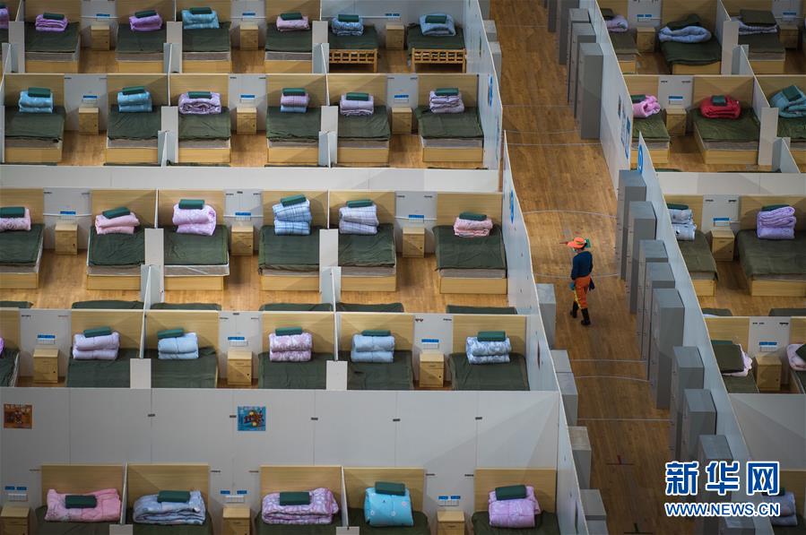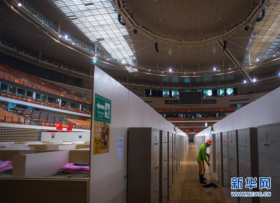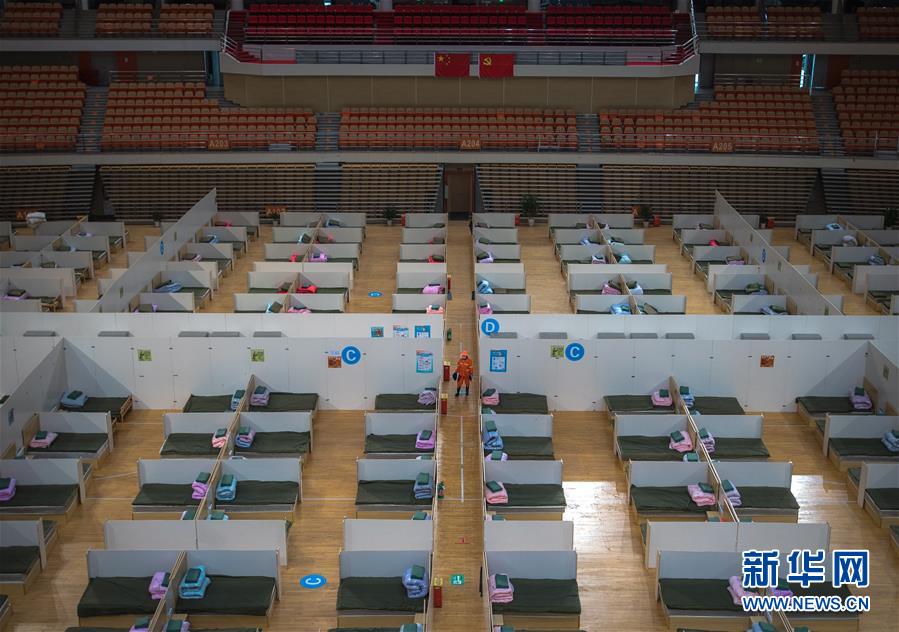 2月12日拍摄的武汉体育中心方舱医院。当日,武汉体育中心方舱医院具备收治条件,这里将提供1100张医疗床位,收治新冠肺炎轻症患者。新华社记者肖艺九摄