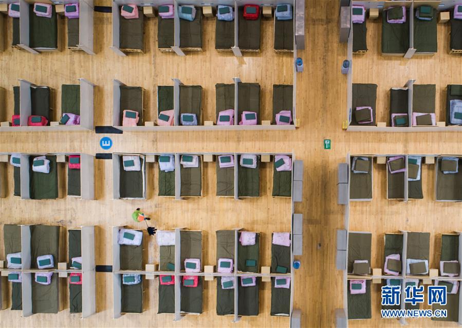 2月12日,在武汉体育中心方舱医院,工人在进行整理和清洁工作(无人机照片)。当日,武汉体育中心方舱医院具备收治条件,这里将提供1100张医疗床位,收治新冠肺炎轻症患者。新华社记者肖艺九摄