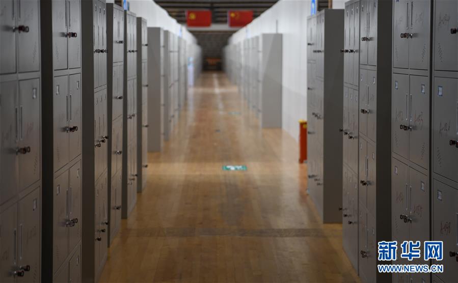 2月12日拍摄的武汉体育中心方舱医院里的储物柜。当日,武汉体育中心方舱医院具备收治条件,这里将提供1100张医疗床位,收治新冠肺炎轻症患者。新华社记者程敏摄