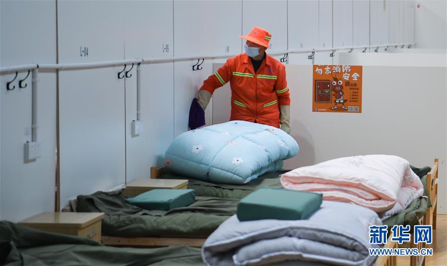 2月12日,在武汉体育中心方舱医院,工人在进行整理和清洁工作。当日,武汉体育中心方舱医院具备收治条件,这里将提供1100张医疗床位,收治新冠肺炎轻症患者。新华社记者程敏摄