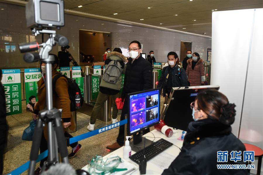 在杭州东站,从贵州乘坐外地复工人员专列抵达杭州的复工人员出站时经过红外测温仪(2月16日摄)。出站后,这些员工将直接被所在的企业接回。2月16日22时7分,载有近300名贵州籍旅客的G4138次列车到达杭州东站。这是铁路部门为服务企业外地员工返程而开行的首趟定制专列。新华社记者黄宗治摄