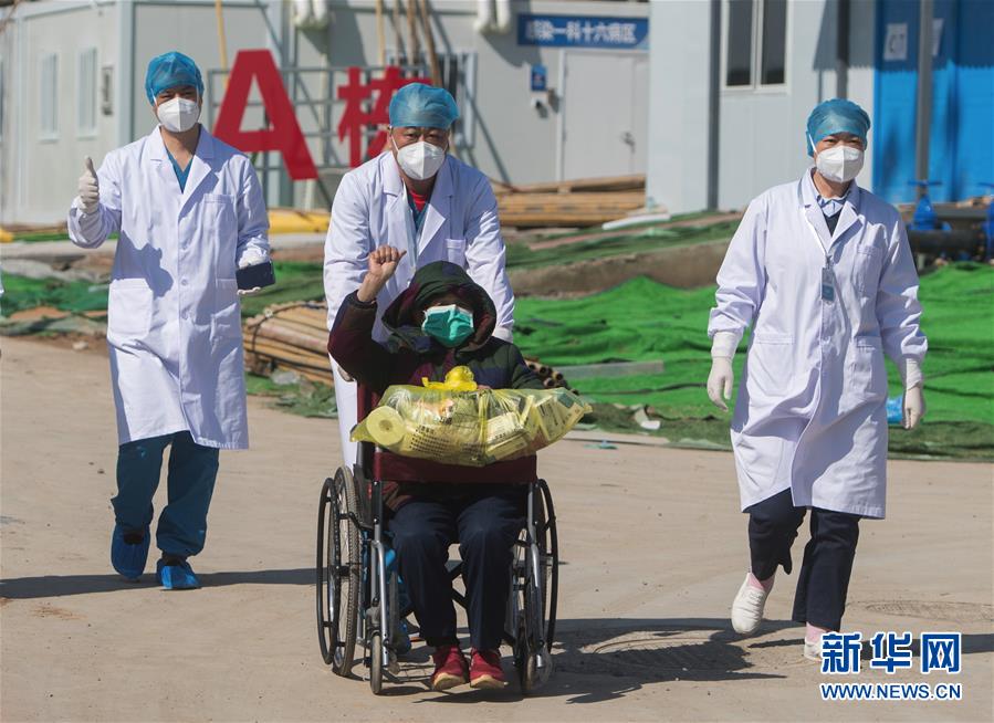 2月18日,在武汉雷神山医院,83岁的治愈患者挥手致意。 当日,武汉雷神山医院首批两名新冠肺炎确诊患者出院。 新华社记者肖艺九摄