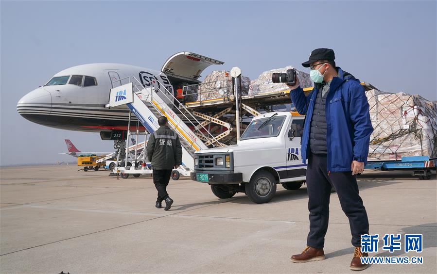 1月28日,新华社记者潘志伟在武汉天河机场采访抢运援助物资。新华社记者程敏摄