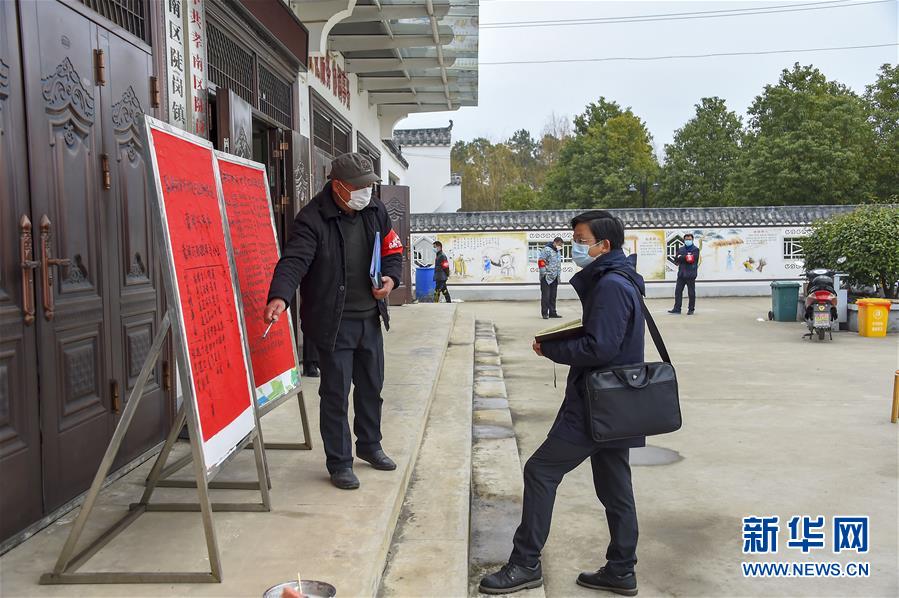 2月10日,新华社记者伍晓阳(右)在孝感市孝南区陡岗镇袁湖村采访农村防疫。新华社记者胡虎虎摄