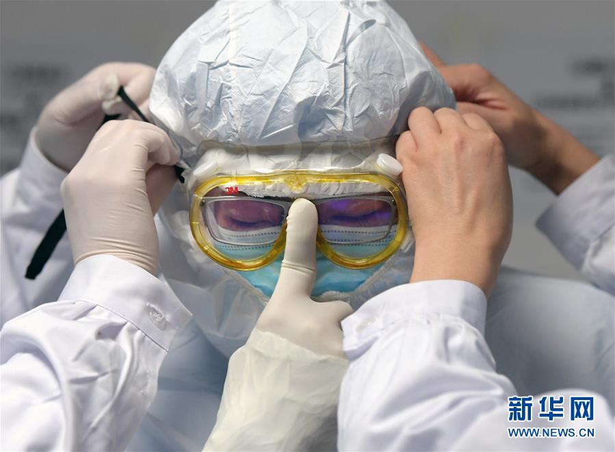 2月20日,两位医护人员按照标准流程为即将进入病区的同事穿戴防护服。针对避免医务人员感染,结合医疗队生活驻地实际情况,驰援武汉抗击疫情的青岛大学附属医院建立起一套卫生管理标准流程,设立了工作地上下班和生活驻地管理标准和规范并严格执行。新华社记者李贺摄