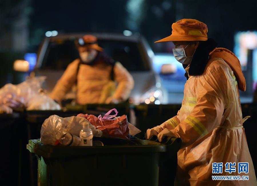 江岸环卫集团工作人员在武汉街头清运社区生活垃圾(2月1日摄)。 新华社记者 李贺 摄
