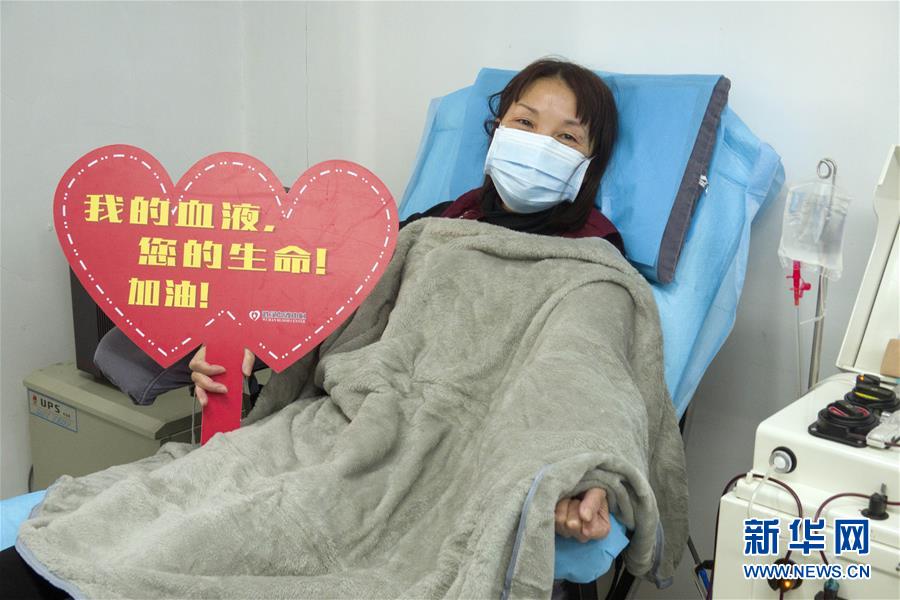 在武汉血液中心的中国医学科学院CPnCoV项目组,康复病人、来自汉口医院的护士蔡桃英在献血浆时拍照留念。她说同事们都在一线忙碌,她献血浆后,再休息几天就准备回到岗位上班,她说自己感染是由于早期防护不足经验不够造成的,再次回到工作岗位一定没有问题(2月17日摄)。 新华社记者 才扬 摄